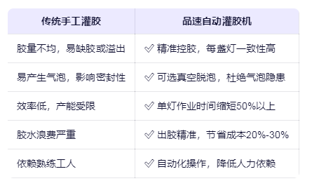 ? 生產效率高:每分鐘可完成1~3盞燈灌膠,適合中小批量連續生產。